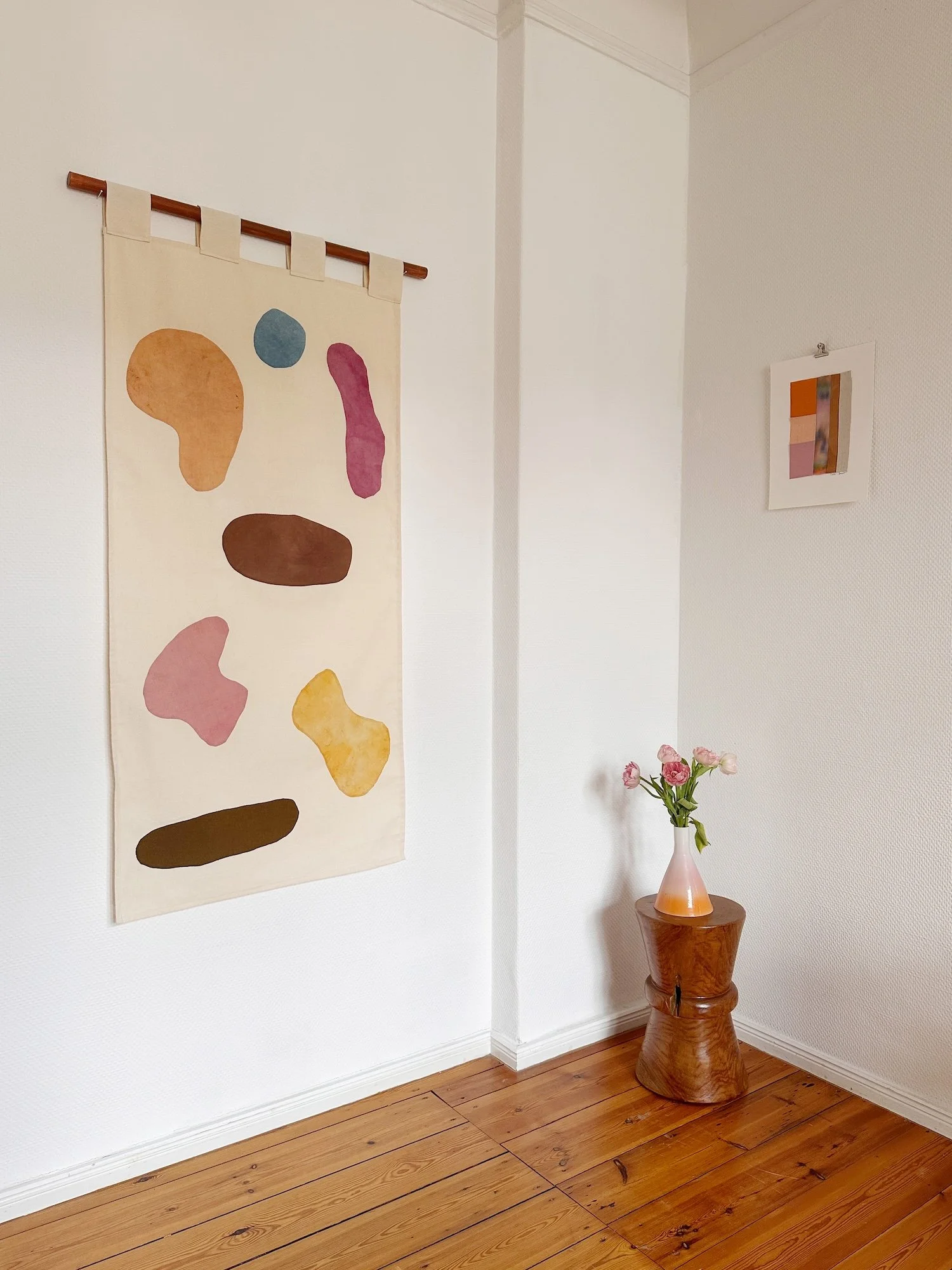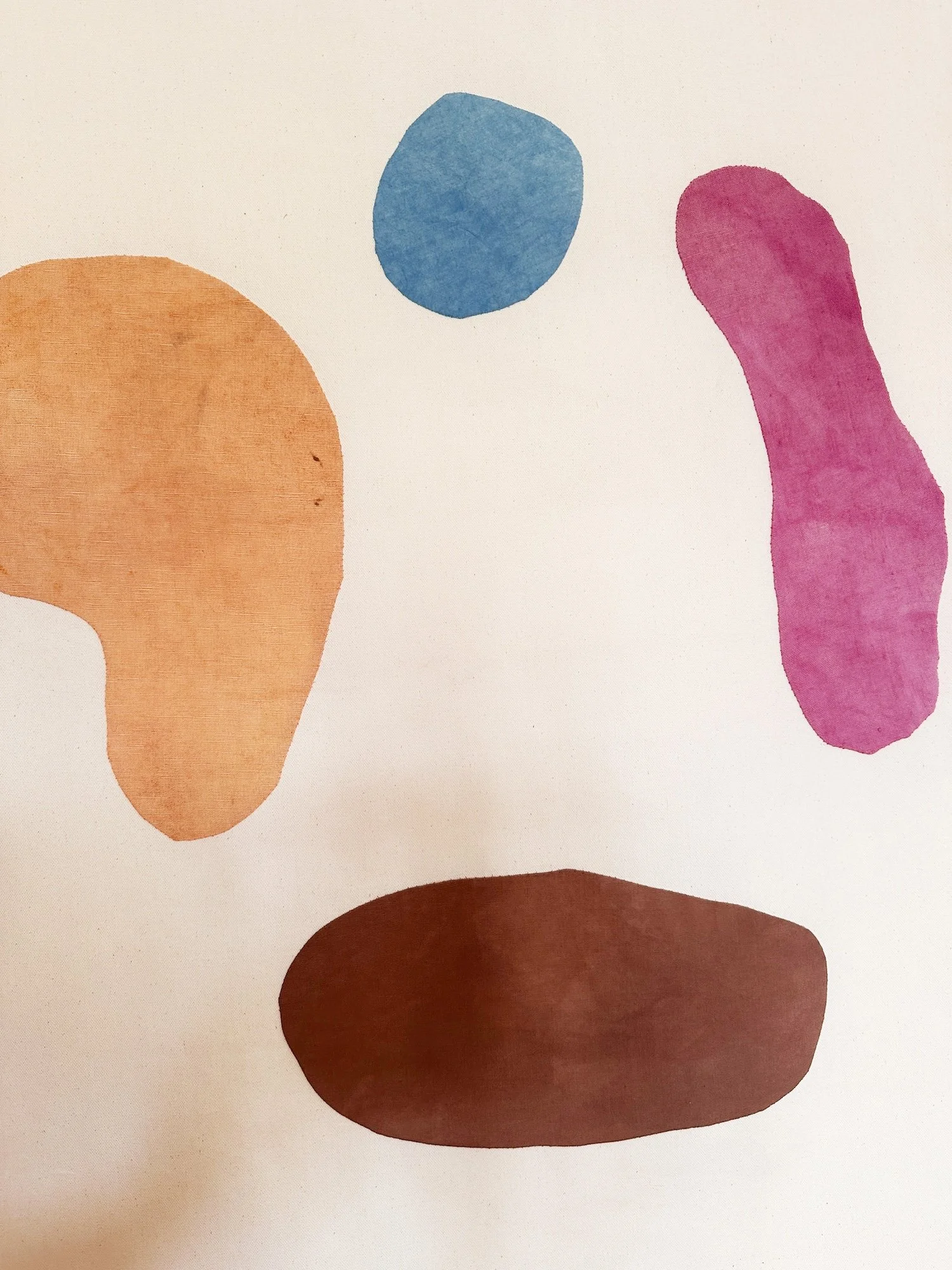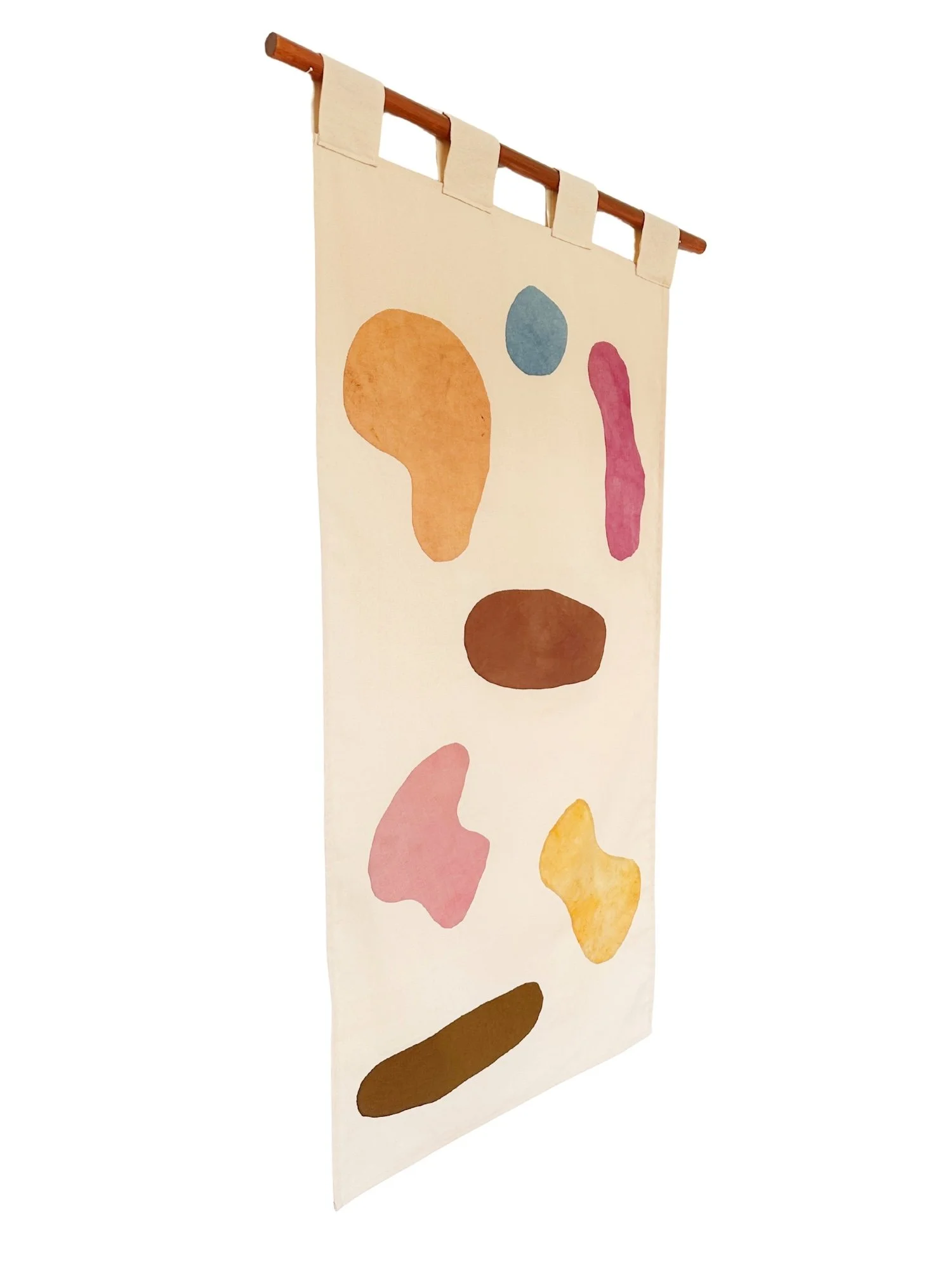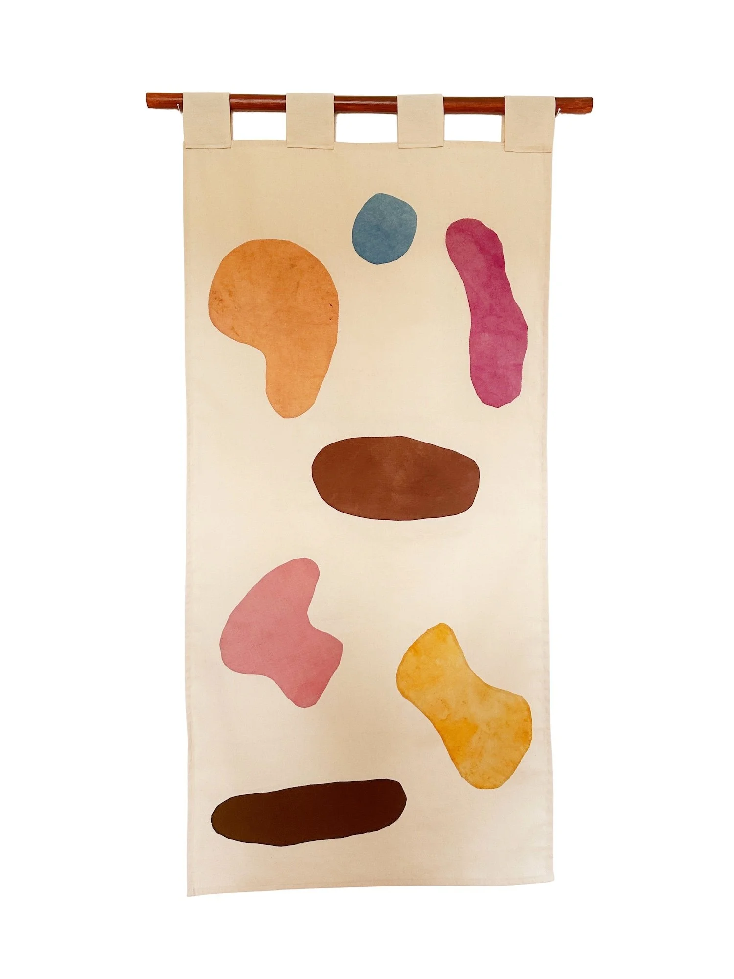 Naturally dyed cotton, silk and linen on Mexican cotton, teak-oiled oak bar